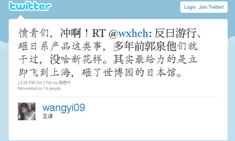 The tweet was actually a retweet, sent by her fiance Hua Chunhui in the midst of anti-Japanese demonstrations in China last month. The original tweet urged the protesters to smash Japan’s pavilion at the Shanghai Expo; Cheng Jianping merely retweeted it, adding the words, “Charge, angry youth.”