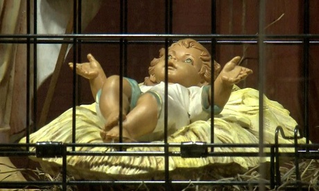 Earlier this year an Indianapolis church put up a similar display showing Jesus, Mary and Joseph surrounded by metal fencing.