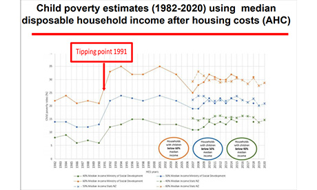 Right now there are 156,700 children in poverty in households with less than 50% median equivalised disposable household income before deducting housing costs (BHC), 53,600 identify as Maori, 72,600 identify as pakeha.