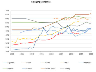 The interplay between the evolution of within-country inequality and between-country inequality, coupled with the differential growth performance of emerging and advanced economies, in recent decades presents an interesting picture of middle-class dynamics at the global level (as depicted by the well-known "elephant curve" of the incidence of global economic growth). It shows, for the period since 1980, a rising middle class in the emerging world and a squeezed middle class in rich countries.