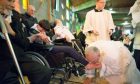Bergoglio down on his knees, cleaning a bathroom]]>
