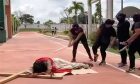 The reenactment depicts militant feminists beating Christ, who had fallen to the ground.