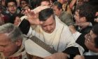 Inside the cathedral, there were clashes between the bishop's opponents, carrying black balloons, and supporters, carrying white ones.