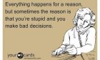 "Everything happens for a reason." I've heard this said more times than I care to. I'm not sure where it came from either, but it's definitely not in the Bible. The closest thing I can come up with is "To everything, there is a season," but that's not exactly the same. The fact is that faith, by definition, is not reasonable. If it could be empirically verified with facts or by using the scientific method, it wouldn't be faith. It would be a theory. Also, consider how such a pithy phrase sounds to someone who was raped. Do you really mean to tell them there's a reason that happened? Better to be quiet, listen and, if appropriate, mourn alongside them. But don't dismiss grief or tragedy with such a meaningless phrase. Read more