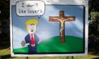 The sign depicted US presidential candidate Donald Trump standing in front of the crucified Jesus, holding a hammer and saying, "I don't like losers".