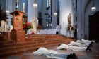 To receive communion, floor markings have been laid out to avoid people coming too close to each other.