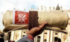 Chiefs and taupou in traditional regalia were part of the guard of honour of mainly bare chested and tattooed men lining the outskirts of the malae (marae) and the immediate area where another taupou used her bare hands to mix the royal ava for the chief guest.