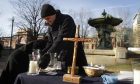He plants himself behind a makeshift altar, light-blue stole draped over his peacoat, and asks the people milling about to "gather 'round."