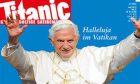 On the front cover of Titanic, an apparently incontinent Pope Benedict appears in a cassock that is soiled yellow below the waist. Above the picture is the headline "Hallelujah in the Vatican: The leak has been found!"