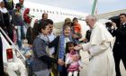Three refugee families, including six children, boarded the Pope's plane for Rome at the end of his short visit on April 16.