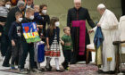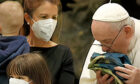 Francis held the flag as he welcomed a half-dozen Ukrainian refugee children up to the stage of the Vatican audience hall at the end of his Wednesday general audience and gave them each a giant chocolate Easter egg. He urged prayers for them and for all Ukrainians.