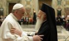 Pope Francis listened to the words of the patriarch seated on an armchair rather than the throne that is customarily used in the Clementine Hall.