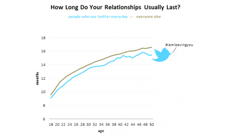 Time Newsfeed reports that a study by OkTrends shows the more frequently you use Twitter, the shorter your relationships tend to be.