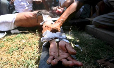 Ruben Enaje, a 50-year-old sign painter, screamed in pain as villagers dressed as Roman centurions hammered four-inch stainless steel nails through his palms and set him aloft on a cross under a brutal sun in San Pedro Cutud in Pampanga.