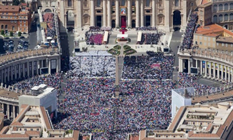 St Peter’s Square was jam-packed and the crowd stretched as far back as the Tiber River, more than half a kilometre away. The throng of devotees, many carrying national flags and singing songs, had moved towards the Vatican area from all directions from before dawn to get a good spot for the Mass.