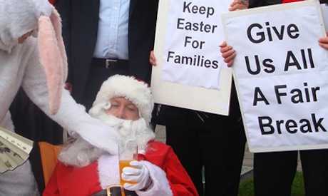 Labour’s industrial relations spokeswoman Darien Fenton said that central to the issue was workers’ right to enjoy time off with family, which was only guaranteed three-and-a-half days a year: Easter Friday and Sunday, Christmas Day and half of Anzac Day.