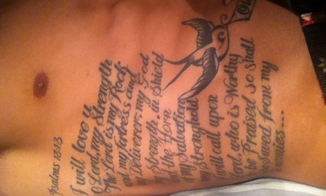 Among the most ornate of the dozen or so main tattoos is a detailed depiction of Jesus carrying the Cross. An extract from Psalm 18 can be read to one side of his impressive six-pack.