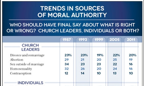 In the 2011 NCR survey, researchers pointed to a post-Humanae Vitae effect, where the Vatican’s rejection of contraceptives dented its moral authority, evident in the five surveys conducted since 1987. The latest figures show Catholics siding with personal conscience as the final decision-maker on the morality of remarriage without an annulment (47 percent), abortion (52 percent), nonmarital sex (53 percent), homosexual activity (57 percent) and the use of contraceptives (66 percent).