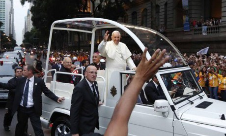 The open popemobile also entices people to engage in a game of toss — hefting hats, T-shirts, rosaries, flowers, flags, notes and other goodies toward the pope, who almost always makes the catch.