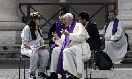 Pope Francis surprised thousands of teenagers by personally hearing confessions for more than an hour in St Peter’s Square on Saturday.