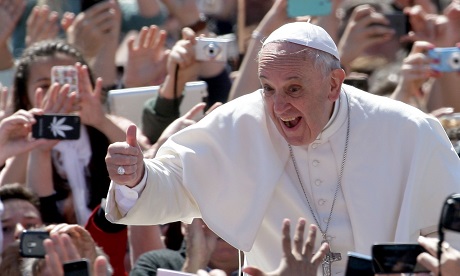 The cover photo shows Francis giving a thumbs-up. Written in pink letters, the photo is entitled ‘Francis: the Pop Pope’ .
