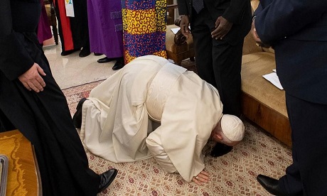 Pope Francis knelt to kiss the feet of South Sudan’s previously warring leaders urging them to respect the armistice they signed and to commit to forming a unified government next month.