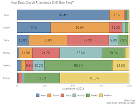 The overall shifts come into starker relief when just observing the changes from 2010 to 2014. The rows going down the left side of the above graph are individuals’ self-reported church attendance in 2010 and the size of the bars going left and right indicate where those groups ended up in 2014. Continue reading