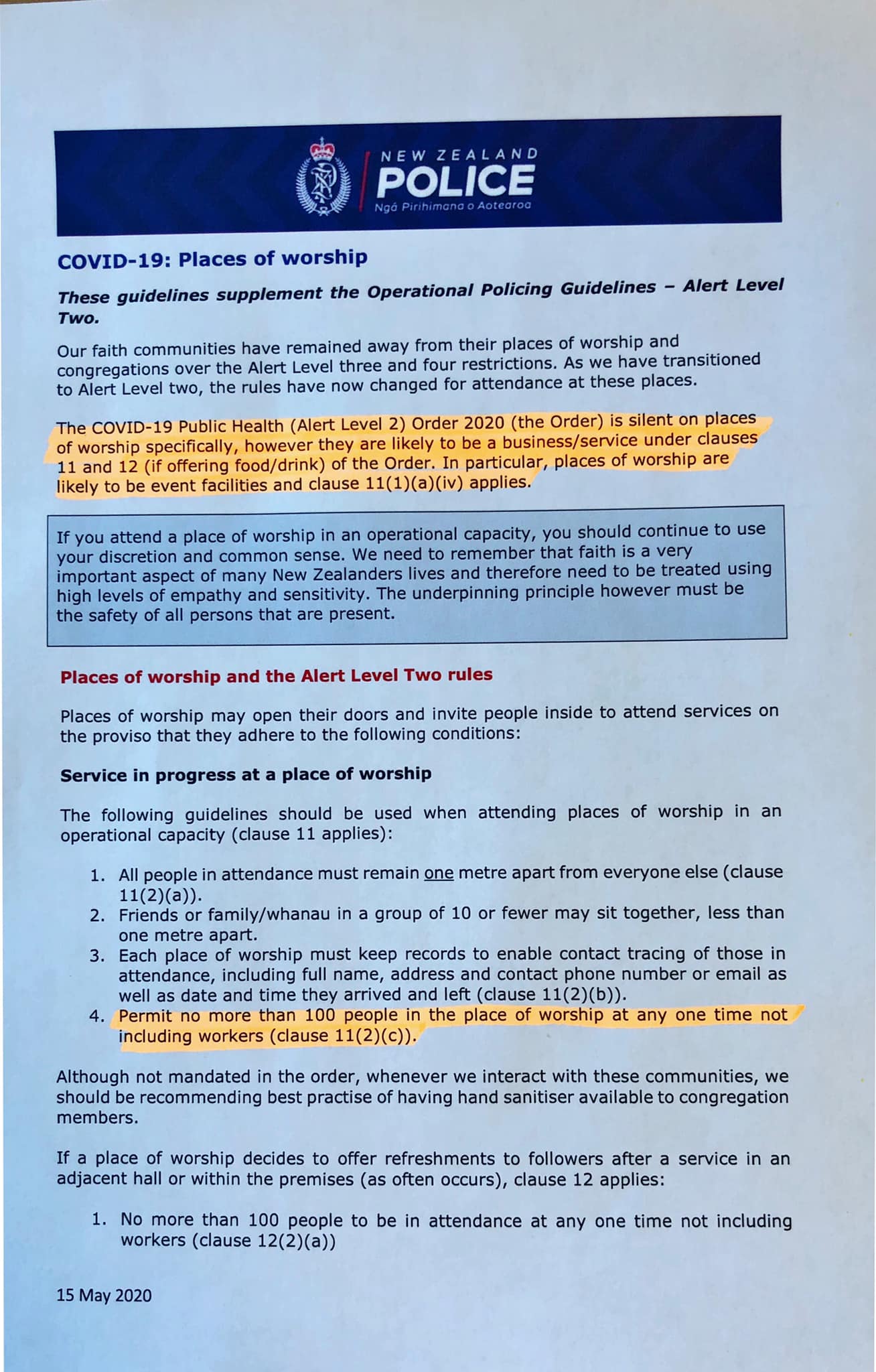 Finally, Policing Guidelines, dated 15 May, which instruct officers on how to conduct themselves under Level 2 recognised the fact that the COVID-19 Public Health legislation did not prohibit congregations gathering for worship under 100 people.