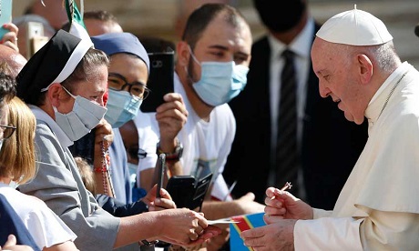 During his first general audience in six months, Francis removed his face mask, chatted to and touched members of the 500-strong crowd.