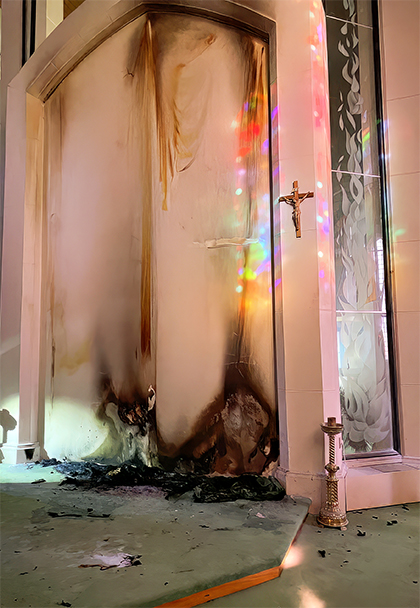 The altar is also damaged at one end, and the carpet in the area is also fire and water-damaged.
