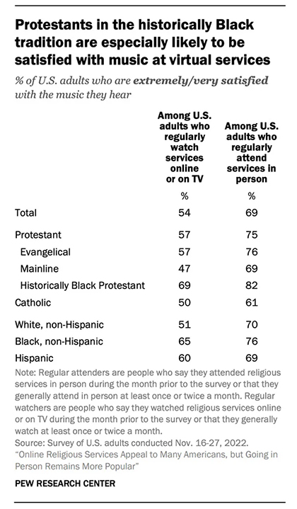 Among Protestants, 75% of those who regularly attend services in person and 57% of those who regularly watch on TV or online are extremely or very satisfied with the music.