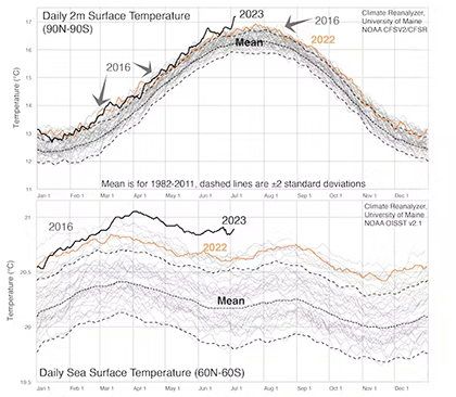 Now, in 2023, all kinds of records are being broken. The highest daily temperatures ever recorded globally occurred in early July, alongside the largest sea surface temperature anomaly ever.