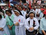 Nuns and priests in Manila have led a rally of around 10,000 Catholics in protest against a proposed birth control bill that would provide free contraceptives and introduce reproductive health and sexuality classes in schools. The protesters, many dressed in red, gathered at a Catholic shrine to voice opposition to the  bill, which would also Read more